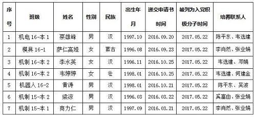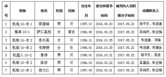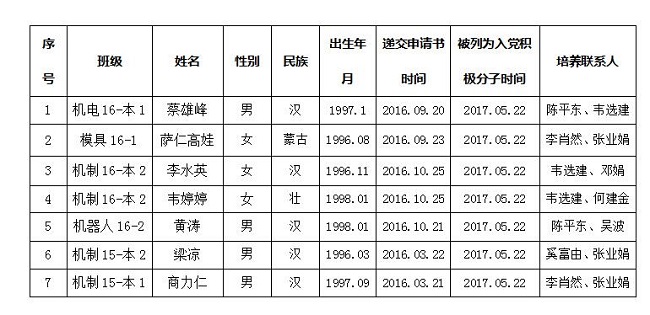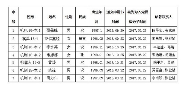 经党组织一年以上的培养教育和考察,蔡雄峰等7位同志被列为党员发展对象,机械与控制工程系第二、第四党支部拟在近期召开党支部大会讨论他们的入党问题。为了进一步增强发展党员工作的透明度,确保发展新党员的质量,根据《中国共产党发展党员工作细则(试行)》和自治区党委组织部关于印发《关于在发展党员工作中实现入党前公示的暂行规定》的通知(桂组通字[2000]91号)文件的有关精神,现将发展对象名单公示如下,公示期7天,自2018年5月25日至2018年6月1日止。对他们的入党问题,如有异议,请以书面形式并署真实姓名,于2018年6月01日前向机械与控制工程系总支部委员反映。
