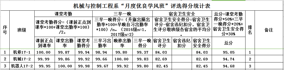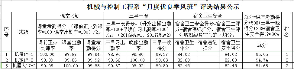 根据“月度优良学风班评选”制度,遵循公开、公平、公正的原则,2018年春季学期3、4月份优良学风班评选经过学风督察组评定,系部审核,评出机修17-1班、机械17-2班和机器人17-2班为机械系2018年春季学期3、4月份优良学风班,公示期为2018年5月28日至5月30日。如有异议可在公示期间到系办公室藏修楼3206韦选建老师处反映情况,电话:0771-5075928。
