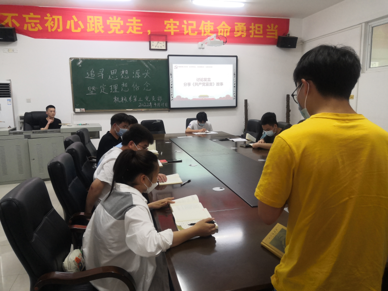 会前,全体党员齐唱国歌。在庄严肃穆的国歌过后,支部副书记丁敬煜领学《新时代的中国青年》白皮书。然后,全体党员自主阅读《共产党宣言》,在阅毕后,在场党员轮流发表学习心得以及分享《共产党宣言》相关故事:丁敬煜同志为大家分享了陈望道先生翻译《共产党宣言》的党史故事;教师党员唐庆同志为在场学生党员寄语,马克思在他的时代乃至为后世做出了巨大贡献,一个时代的人干一个时代的事,新时代的中国青年要奉献到中国特色社会主义新征程去;学生党员刘永飞同志表示,我们要不断从马克思主义经典著作中汲取力量。讨论完毕,全体党员又学习了世界共产主义运动史和齐唱国际歌。