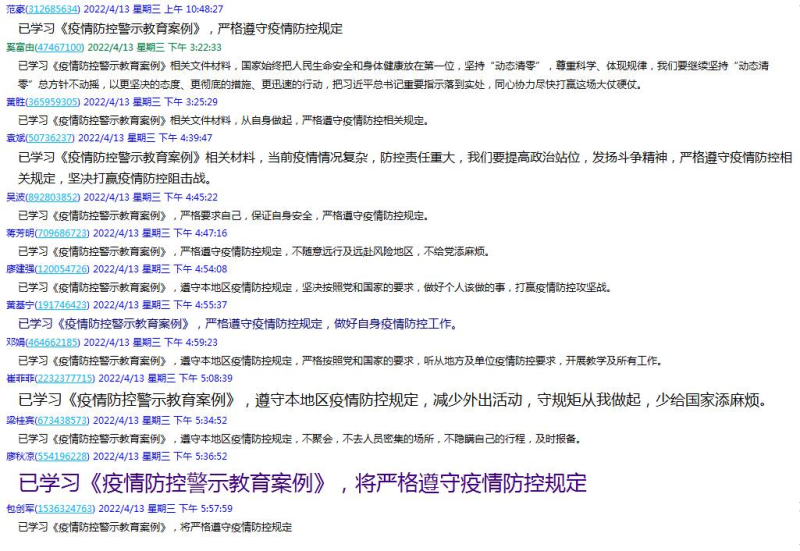 最后,邓娟同志谈到了自己的学习心得:通过本次学习,对各级疫情防控政策与措施有了更深刻的理解,在今后的工作生活中,除了自觉服从疫情防控要求外,要进一步关心因疫情无法返校进行线下上课的学生,同时对教学过程中课程思政的切入点也有了新的思路。