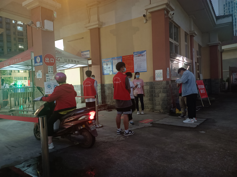 2022年5月14日晚上19点,我系第三党支部正式党员李莹娜,预备党员周丽娟,发展对象覃建程、罗柳、黄凤青在分校大门参与防疫志愿服务活动。