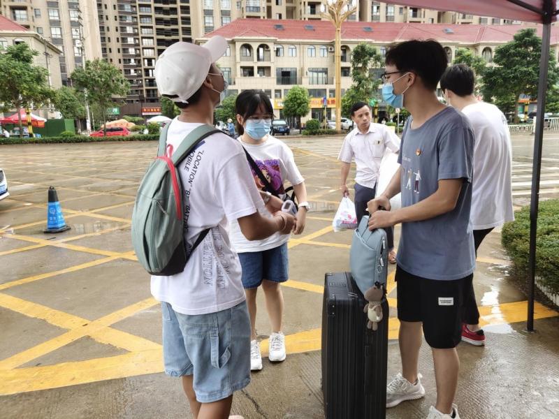 疫情防控不能松,良好的防控措施必不可少。为让此次迎新工作顺利进行,首先需要新同学在“钉钉”上上报行程等一系列情况,安排在校门迎新的志愿者需要给每位进入校园的同学测量体温,体温正常,钉钉通过,方能进入校园。看着一个个家长满眼带着期望与不舍的眼神把孩子送进校园,与孩子看到学校时的期待和向往的眼神形成鲜明的对比。繁琐的工作使志愿者们更加丝毫不敢松懈,良好的工作素质和态度是志愿者成为迎新工作靓丽风景线。