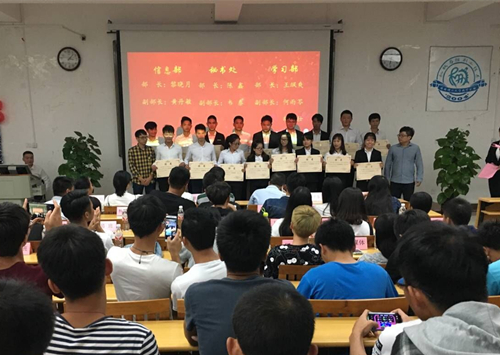 换届大会以学工部黄维老师致辞开始,我系15级委员代表蔺德志主席对上一年的工作进行了总结,大会上老师对15级委员颁发聘书并由15级委员为16级委员挂牌。最后由我系主任黄荣学老师为本次换届大会做总结发言:老师首先对我系团总支学生会学生干部的辛勤付出表示感谢也为新一届委员的当选表示祝贺,希望新一届学生干部增强做好学生会工作的责任感和使命感,增强工作的时效性;然后要求学生干部要拓宽服务领域,不断满足我系同学成长成才的需求;再次,要求进一步加强学生会的自身建设,不断增强学生会干部的组织观念;望大家珍惜这一机会,为同学服务,为团总支学生会的发展尽一份力,确立服务同学的理念,发扬扎实工作,务实实效的工作作风,希望新委员精诚团结、相互合作、彼此鼓励的面对压力与挑战。使我系的学生工作更上新台阶。