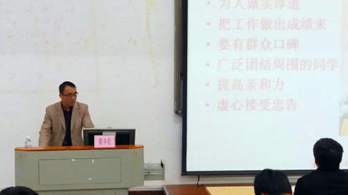 讲座上,梁冬松书记向同学们详细的诠释了学生干部的责任和义务是什么,我们应该怎么做,以及学生干部的身份双重性,工作的独立性,流动性,义务性;梁老师指出:我系学生干部在学风建设中还存在许多问题,比如没有正确处理好学习与工作的关系、一些不文明的行为和违纪行为等,梁老师希望学生干部以学业为重,要有组织有纪律,要有责任心,树立好自己的带头形象,积极带领同学们做好学风的建设。