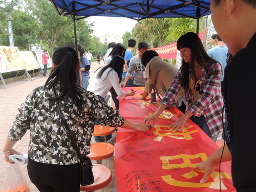 为了增强我系学生校园安全意识,2015年4月24日在分校食堂门口我系开展校园安全教育宣传签字仪式及违规电器展示活动,活动中同学们结合校园教育喷绘宣传展示及收缴的违规电器展示,深刻体会到校园宿舍安全的重要性,纷纷踊跃在安全教育主题横幅上签字,为更好的校园安全从我做起,从自身遵守学校规章制度不适用违规电器切身做起。