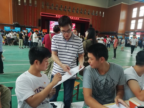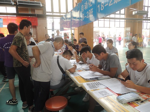 上午七点,学校迎新工作正式拉开序幕,体育馆报名现场人流攒动,报名工作有条不紊地开展。新生和家长们在志愿者的指示和带领下,依次到所在院系报名、缴费、领取宿舍钥匙和军训服装等物品。