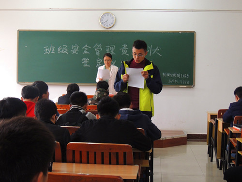 仪式开始,先由各班级代表宣读班级安全管理责任状,随后学工组组长莫天荣老师、辅导员李肖然老师、辅导员张业娟老师分别进行发言,对班级安全管理责任状的条例进行详细说明,强调了应注意学习与生活各方面关于安全的问题及注意事项,并要求各班班干监督好本班同学的学习和生活,对违纪行为和隐藏的不安全因素及时进行劝诫和防范,遇到不可控情况及时告知辅导员解决;最后,各班班干代表签署班级安全管理责任状。