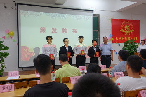 换届大会以一段激励奋进自制录制的视频为开头,视频中学生会14、15级干事志气满满的宣读出了自己部门的宣言,表达了对新加入学生会的16级试用干事的欢迎;然后莫天荣老师发言:希望学生会干部可以加强理论学习,作为好的风气的倡导者和宣传者;同时希望学生会干部学会服务,以服务同学为宗旨,努力提高学生会干部素质。而后第五届团总支学生会学生干部代表梁廷钦发言,对之前照顾并支持着我们的老师同学们表示了感谢,也对下一届学生会委员们提出了自己的理想,希望我们能比他们做的更好,带领学生会走向更辉煌的明天;接着进行的是第五届学生会聘书颁发仪式,谢晓明老师和张斯亮老师为第五届学生干部颁发聘书后,张斯亮老师宣读了第六届团总支学生会委员名单,莫天荣老师和罗勇老师为第六届团总支学生会委员进行了挂牌。