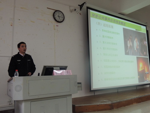 培训由分校保卫工作部副主任邹志友老师为主讲,邹老师首先以探讨的方式提出问题:针对高校突发事件如何应急预案设置与处理?同时通过我国近几年发生的重大事件和身边的一些突发事件为例详细解说应急预案的处理方法。然后,请同学上来现场演练在紧急情况下如何救护伤者,并播放了突发事件演练视频,以现场演示和视频的形式直观地告诉学生干部在平时的学习和生活中要时刻预防、时刻预警、时刻监督。