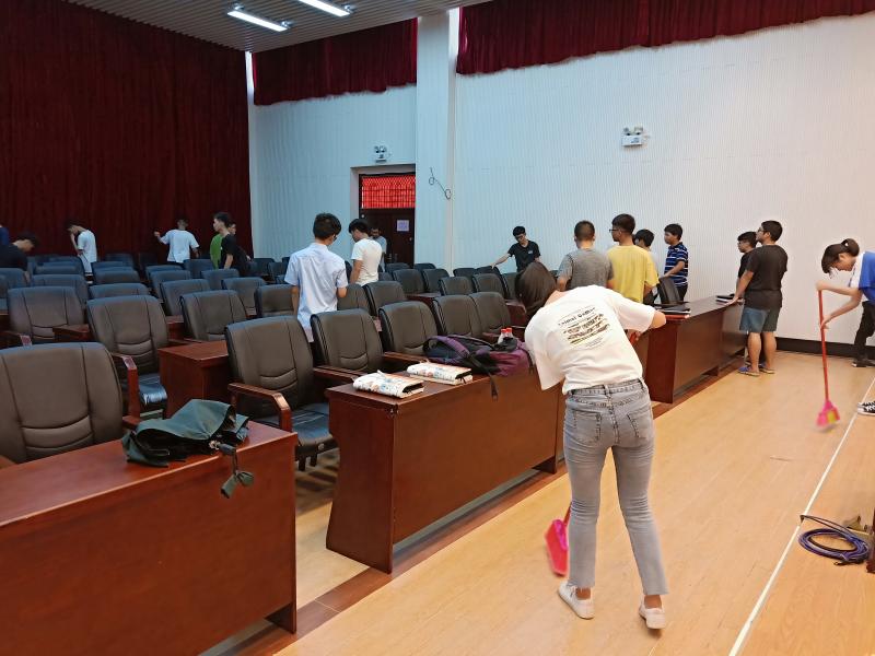 活动开展过程中,同学们都积极主动的配合老师布置图书馆报告厅现场,把桌子、凳子安要求摆放整齐,检查凳子是否损坏,以防开会过程中有人因凳子损坏而摔倒。最后进行卫生打扫,让报告厅变得干净整洁。