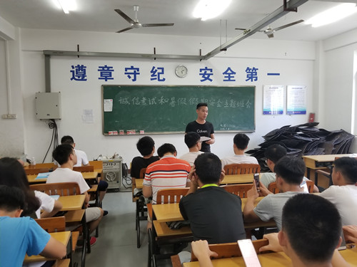 珍爱生命, 安全第一。7月4日下午,机械系工业机器人17-1班在金工实训中心开展诚信考试及暑假安全主题班会,本次主题班会由班主任覃庆松主持召开。