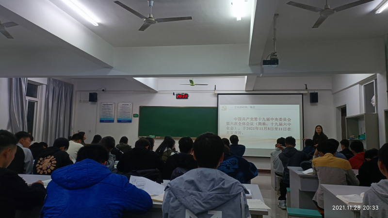为了让同学们能够跟上政治思潮,学习十九届六中全会精神,我系智造21-本1、2班开展学习十九届六中全会精神主题课程。本次课程于2021年11月28日星期天晚上在藏修楼3402展开,由辅导员丘东林老师主持,智造21-本1、2班全体同学参与到课堂之中。