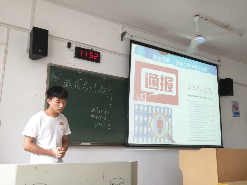为增强同学们诚信考试的意识,6月9日11点50分,机电18-本1班、2班于2306教室共同开展“诚信考试教育”主题班会,会议以PPT的形式进行,由梁奇翔同学主持。