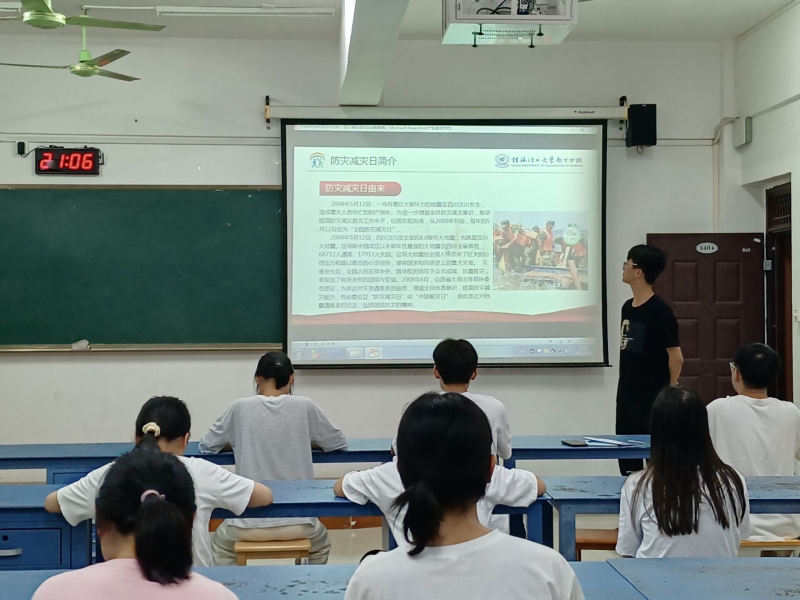 模具20-2班于2021年5月25日晚21:00在3404教室举行“全国防灾减灾救灾”为主题的班会。由班长向同学们介绍各类自然灾害的形成和在发生自然灾害时如何更好地应对。内容包括地震篇、雷电火灾篇、洪水台风篇、沙尘暴泥石流篇、防灾减灾小知识以及校内校外安全篇。