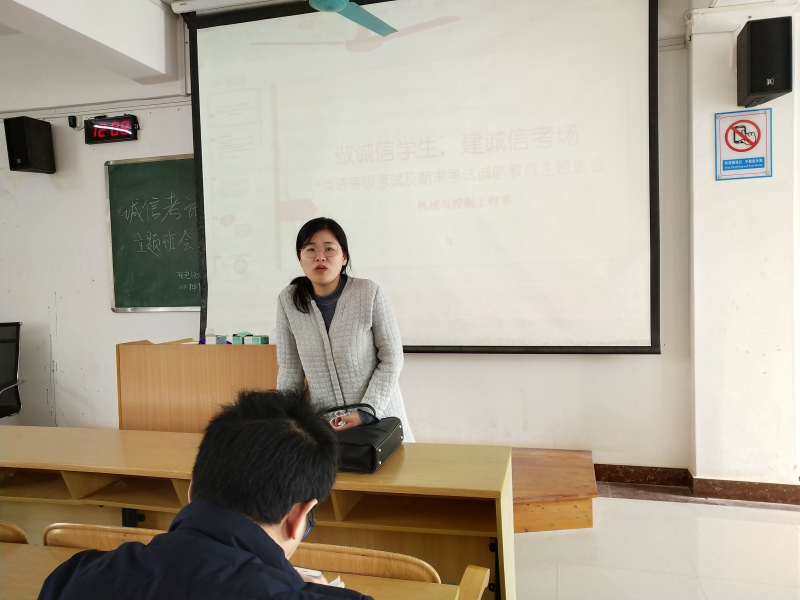 为建立诚信考场,营造良好考试氛围,12月7日11时45分,机电18-本2班在2406教室开展了“做诚信学生,建诚信考场”主题班会,会议以PPT的形式展开,由叶香艳同学主持,参加会议的主要人员:班主任黄基宁老师。