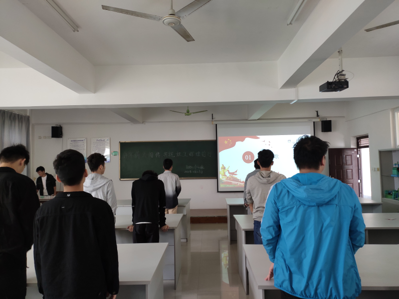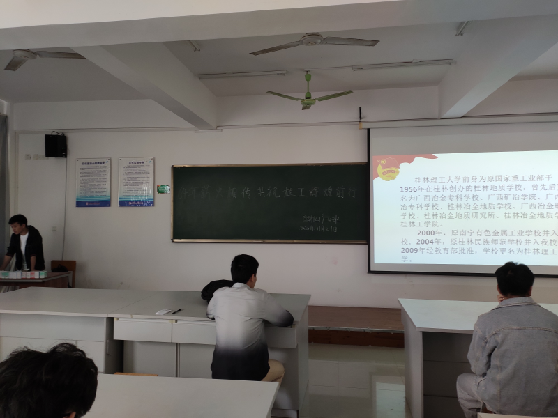 活动伊始,“齐唱国歌”。毕后,由班团支书蒋桂源开始下一章程 ,讲述“桂工历史”,团支书讲到从桂林理工大学的前身1956年历史起讲到几经周转后终于确定如今的校名,桂林理工大学。历经周转,64年薪火相传承,班级团课为母校送上了一波祝福。校史完毕,本次主持人班团支书为同学们给予期望祝语和祝福。之后由班长屈铭发言,对班级近期现况进行发表意见,并鼓励各位班级同学为班级建设出谋划策,提出意见和想法,且对班级未来计划和组织做出规划,对目前的缺勤情况、及班级评奖评优等进行补充发言,同时鼓励班级同学们加强沟通交流,多探讨促进学习。班长发言结束后,本次团日活动在同学们的热烈掌声中结束了本次会议。