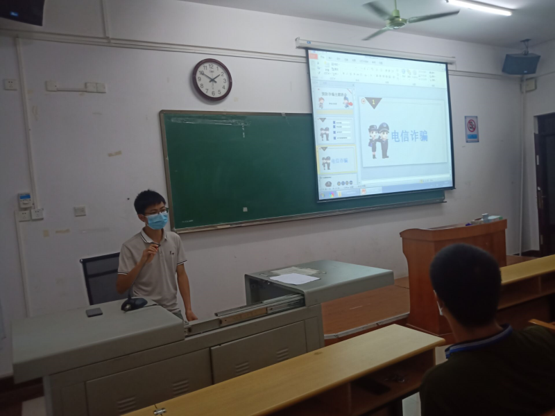 班会上班长跟我们介绍了什么是电信诈骗,观看了相关的视频并邀请受骗的人上台叙述经历。还讲了宿舍盗窃和盗刷饭卡等问题,最后告诉我们如何增强自己的防范意识。