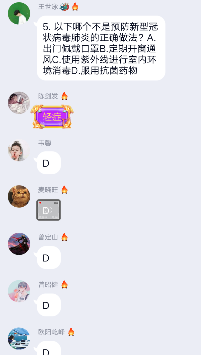 关于这次疫情,团支书王世泳同学首先向同学们介绍了病毒的基本情况,而后询问同学们对疫情的了解程度,同学们都积极反应,表示每天都有关注相关信息,有大部分同学表示自己防疫知识丰富。紧接着是知识竞答环节,此环节中,同学们反应热烈,争相抢答,公布答案后,有疑问的同学提问,懂得同学进行科普,还有同学分享了自己防疫的措施,班里氛围融洽,一团和气。最后王世泳同学表示同学们的意识形态工作做的很到位,防护意识强,同时也提醒同学们,注意保护自身和他人的健康、生命安全。