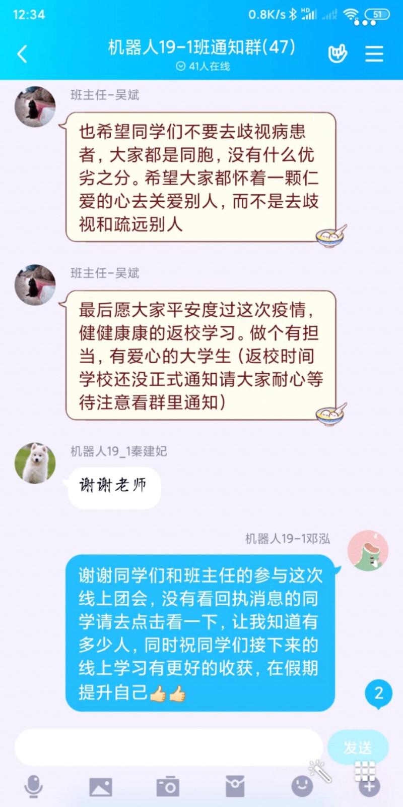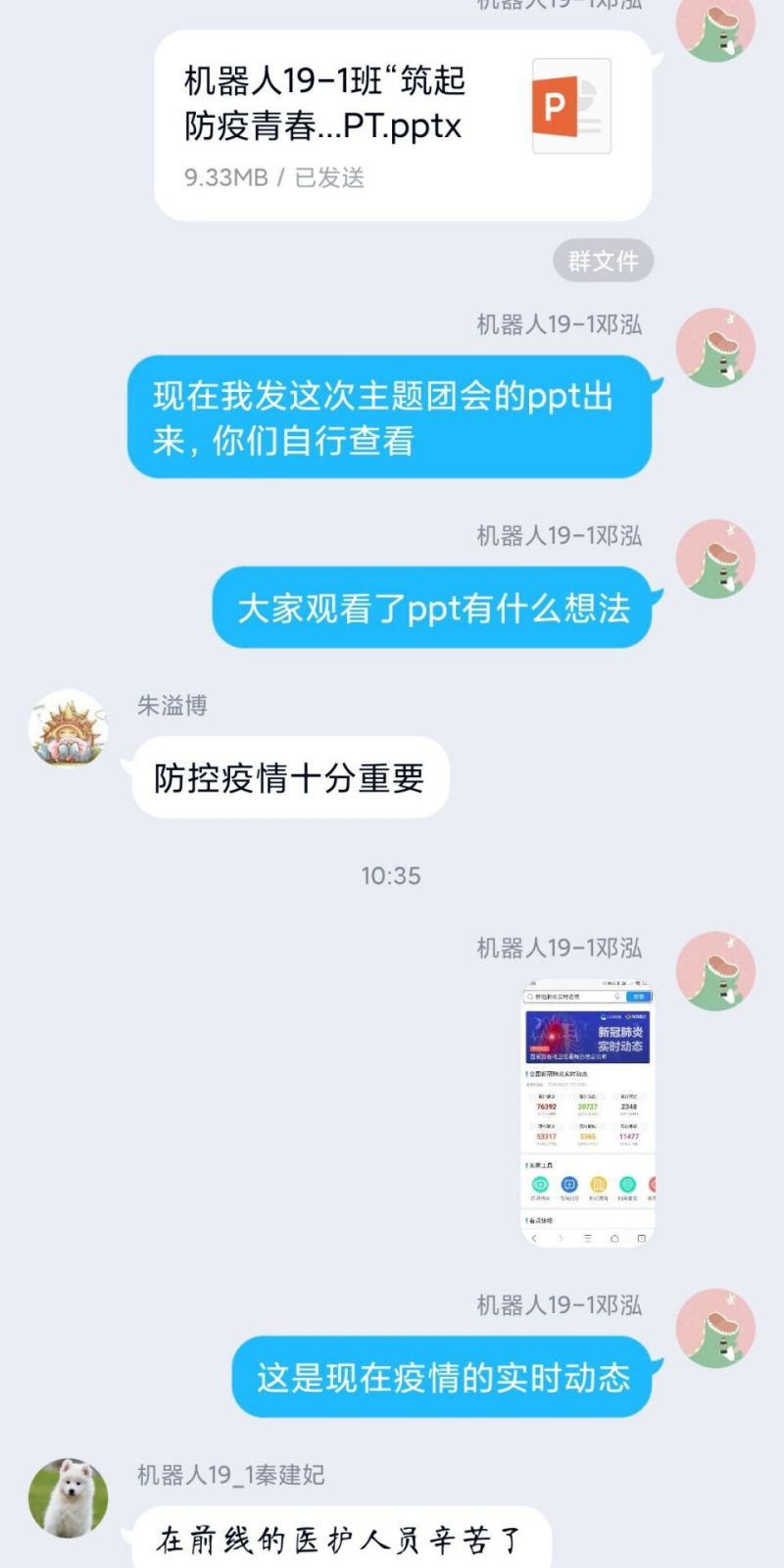 2020年新春伊始,全国多地出现新型冠状病毒感染的肺炎疫情,武汉作为疫情源头,为防控疫情、切断病毒传播途径,打赢这场防疫战,为了促进同学们对新型冠状病毒的认识,我系机器人19-1班于2月22日在线上举行“筑起青春防疫长城”主题团会。