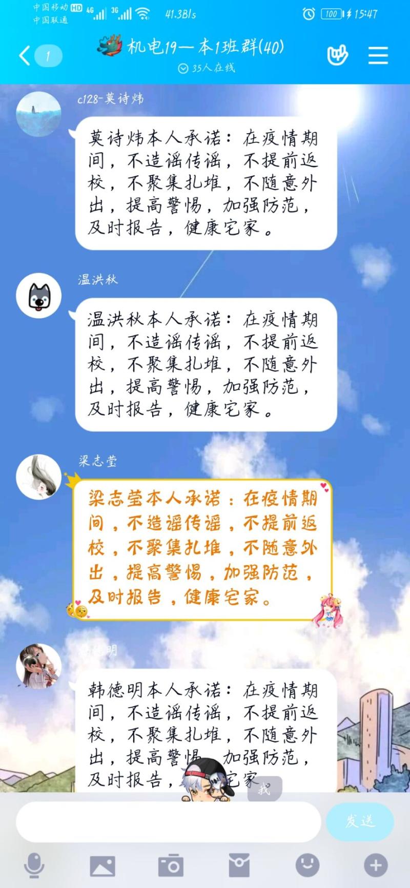活动开始前,由团支书韦文武同学开启班群线上多人语音,后与班长赵作龙同学一起组织同学们有序进入语音房,维持房间的秩序,并且确定全部同学的 人数到齐。活动开始时,由韦文武同学开始讲述新型冠状病毒的传播途径与防护措施。同学们仔细看过《教育部致全国大学生的一封信》、《共青团中央关于坚持党的领导,全团动员,在防疫情阻击战中充分发挥共青团生力军和突击队作用的通知》后在线上进行了深入交流与探讨。随后,由韦文武同学组织全班同学在班群里按照学号统一发送“xxx在疫情期间,不造谣传谣,不提前返校,不聚集扎堆,不随意外出,提高警惕,加强防范,及时报告,健康宅家”的承诺,同学们有序配合完成。然后,同学们积极热情的在线上发送了鼓舞人气的加油稿,共同为武汉加油,为全国人民加油!最后,为了更好的宣传正能量,韦文武同学鼓励同学创作激励人心的作品,并且叮嘱我们要注意防范,给同学们留下衷心的祝福。