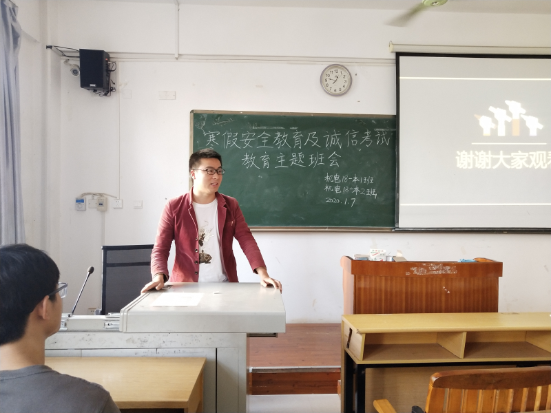 为了让同学们有一个安全愉快的假期和一个顺利的考试, 1月7日,18级机械电子工程一班和二班于6310教室,共同召开了寒假安全教育及考试教育主题班会。此次班会的主要人员有:一班班主任揭施军老师、二班班主任黄基宁老师。