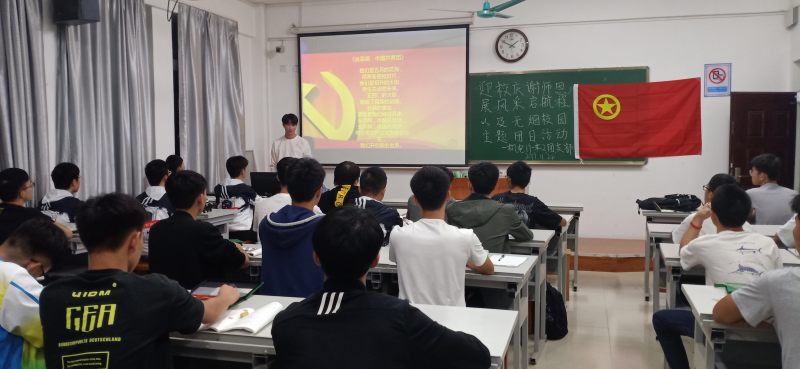 团会以全体同学起立齐唱团歌展开,通过观看桂工短视频了解母校波澜壮阔的发展史,激发了同学们浓浓的爱校之情和对老师那无私奉献的崇高精神的钦佩。为此机电19-本2班的五位同学共同为老师献上《老师,您辛苦了》,表达了对老师真挚的谢意,铭记老师的恩情。与此同时还开展了以创建无烟校园为主题的活动,呼吁同学们积极参与到禁烟活动当中。接下来全体同学起立,一起齐唱校歌,为校庆的到来而欢庆。