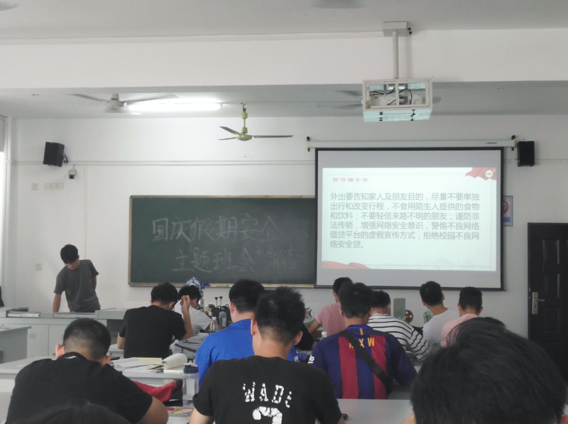 本次班会讲了以下几大安全方面的问题。一、交通安全。注意遵守交通法规,不坐三无车辆。二、游泳安全。我们不可到无安全保障的非游泳区游泳,若发现有人溺水则要在确保自身安全的情况下采取营救措施。三、防诈骗安全。若外出应告知家人及朋友目的,注意加强自我保护意识。四、饮食安全。对于饮食,应自觉养成良好的个人饮食卫生习惯。五、宿舍安全。假期留宿的同学在遵守宿舍管理制度的同时,还要注意用电安全,注意防盗。班会期间,提醒同学们注意安全问题的同时,还播放了相对应的视频,给同学们起一定的警醒作用。最后祝大家国庆快乐。