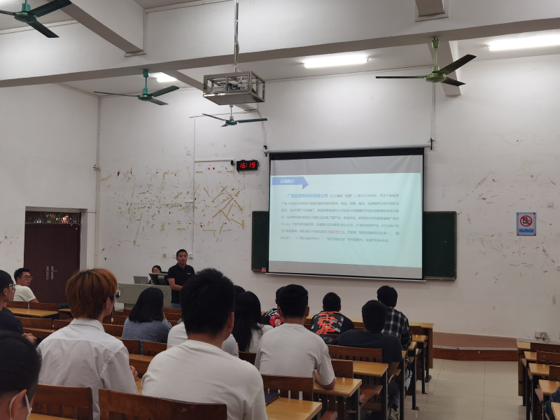2022年11月16日星期三16:10,广西珀源新材料有限公司在我校启智楼8106教室召开专场招聘会我系组织多名毕业生参加,许女士主持广西珀源新材料有限公司宣讲。