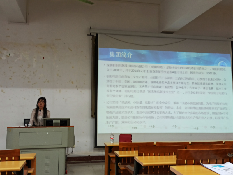 10月21日下午四点半,深圳明阳电路科技股份有限公司(以下简称为明阳电路)在我校启智楼8201D举办了招聘会,本场招聘会由明阳电路人事经理姚雪主持,我系组织100余名毕业生参加招聘会。