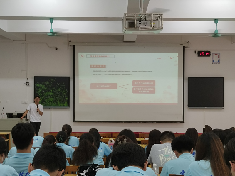 培训中,韦选建老师首先从学生骨干的职责、应当具备的素质以及如何提高能力三个方面对学员做出指导,他强调“学生骨干要做好系部与同学之间的桥梁纽带作用,及时传达和落实系部和学校的工作安排,要发挥主观能动性,积极思考、扎实工作,确保同学们的需求及时得到反馈”。同时,韦选建老师还以学生工作的实际例子作为典型案例,在培训会上进行分析和总结,让全体学员对如何提升执行能力和综合素养更加通俗易懂。