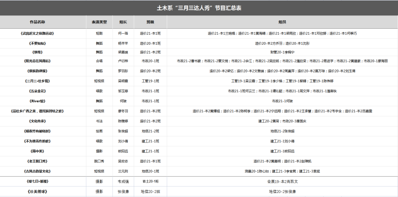 为提高学生的自我展现能力,增强学生的自信心,激发学生热爱生活、热爱校园的丰富情感,为此响应学校号召,特举办“三月三达人秀”比赛为学生提供表现自我的舞台。