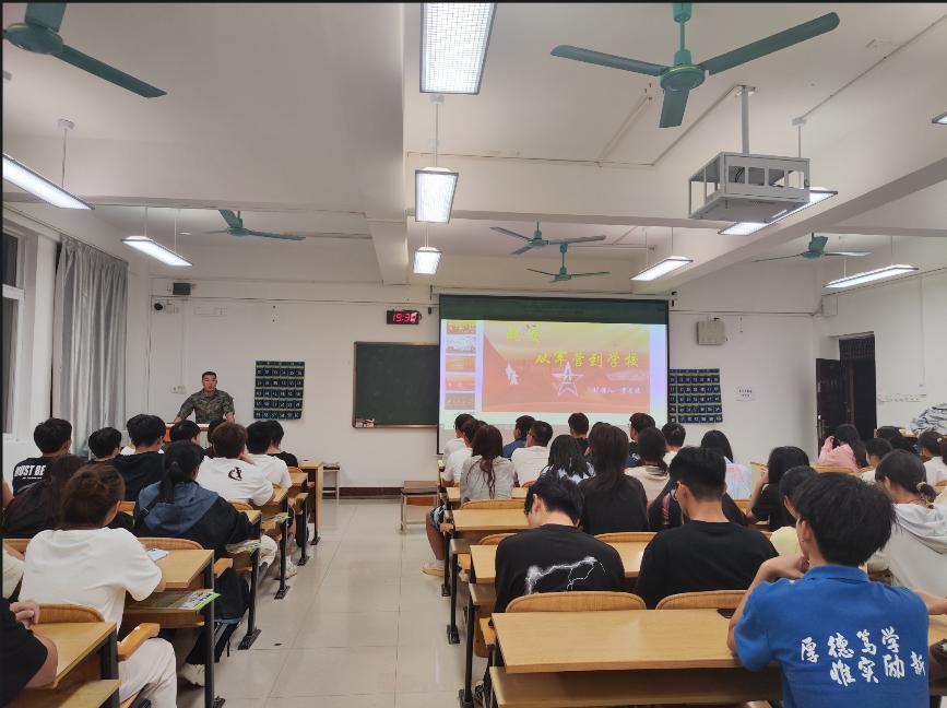 本次活动邀请退役复学优秀学生代表罗昌照,讲述其在驻港部队服役期间训练、学习、生活等方面的成长经历,彰显了军人的忠诚、勇敢和奉献,呼吁学生主动将个人理想与富国强军相结合。罗昌照介绍了我国的国防政策、军队现代化建设情况以及国家安全形势,激发学生的爱国热情,培养历史责任感和使命感。