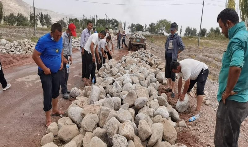 50年一遇的洪水来袭,与村民一起来拉石填土,在村庄外围构筑防御工事。