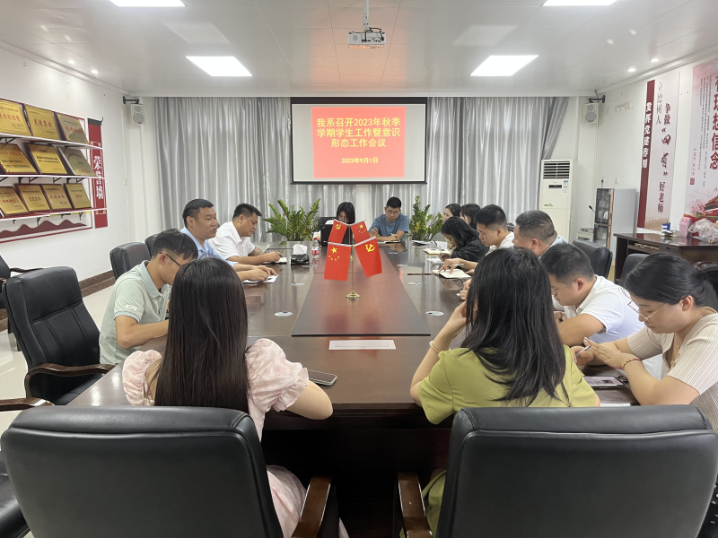 为保证新学期学生工作顺利开展,9月1日上午,我系于物华楼406会议室召开2023年秋季学期新学期学生工作暨意识形态工作会议。全体辅导员到场与会,会议由党总支书记副书记兼学工组组长何建金同志主持。
