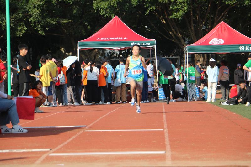 我系运动健儿们在赛场上,眼神坚定,整装待发,少年义气,斗志昂扬。运动健儿们踏条腾空、跨步一跳、划出弧线,空中矫健的姿态,都是他们努力的结果。我系陈博文努力突破自我,以11.20米的成绩取得了第六名。