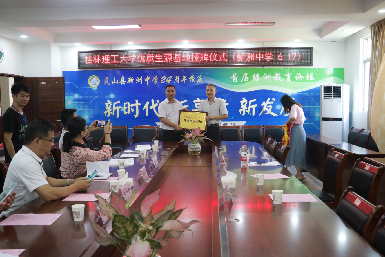 6月17日下午,土木与测绘工程系主任刘茂军、辅导员刘飞及学生年度优秀人物容熔一行三人代表学校赴灵山县新洲中学进行座谈交流,并举行 “桂林理工大学(南宁)优质生源基地”授牌仪式。