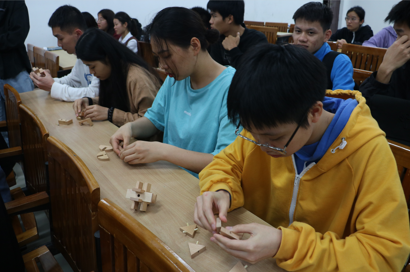 为培养我系学生动手能力,增强我系学子团结互助精神,4月19日下午5时,我系于物华楼205教室举行鲁班锁拆装比赛,同学们踊跃报名参与。