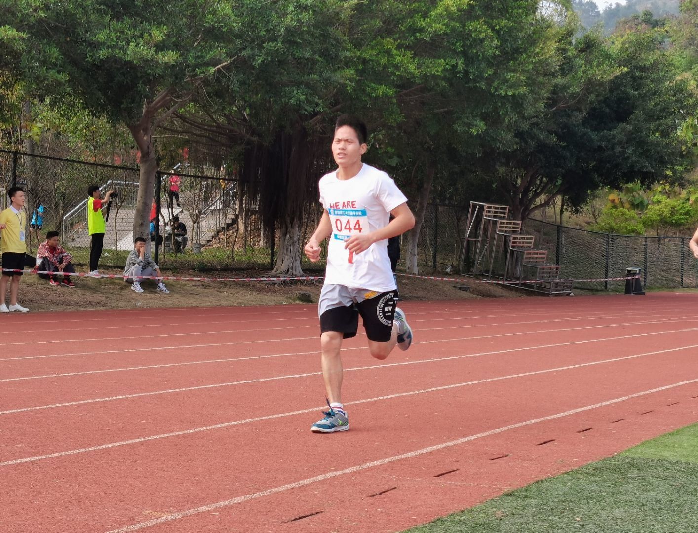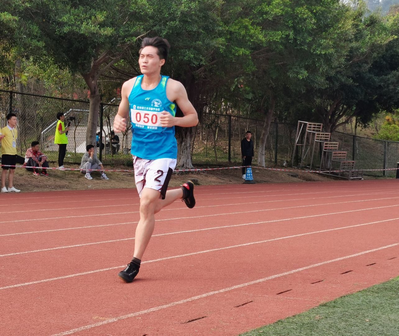 “砰”的一声枪响,我系健儿起跑、提速,一圈、两圈……七圈半,冲刺、越过终点彩带。彩旗为你加油,呐喊为你助兴,延伸的白色跑道上终点线渐渐明亮,最终我系健儿杨长升、覃敏业、蒙金分别以10′57′90、10′59′20、11′06′02包揽前三,祝贺他们。
