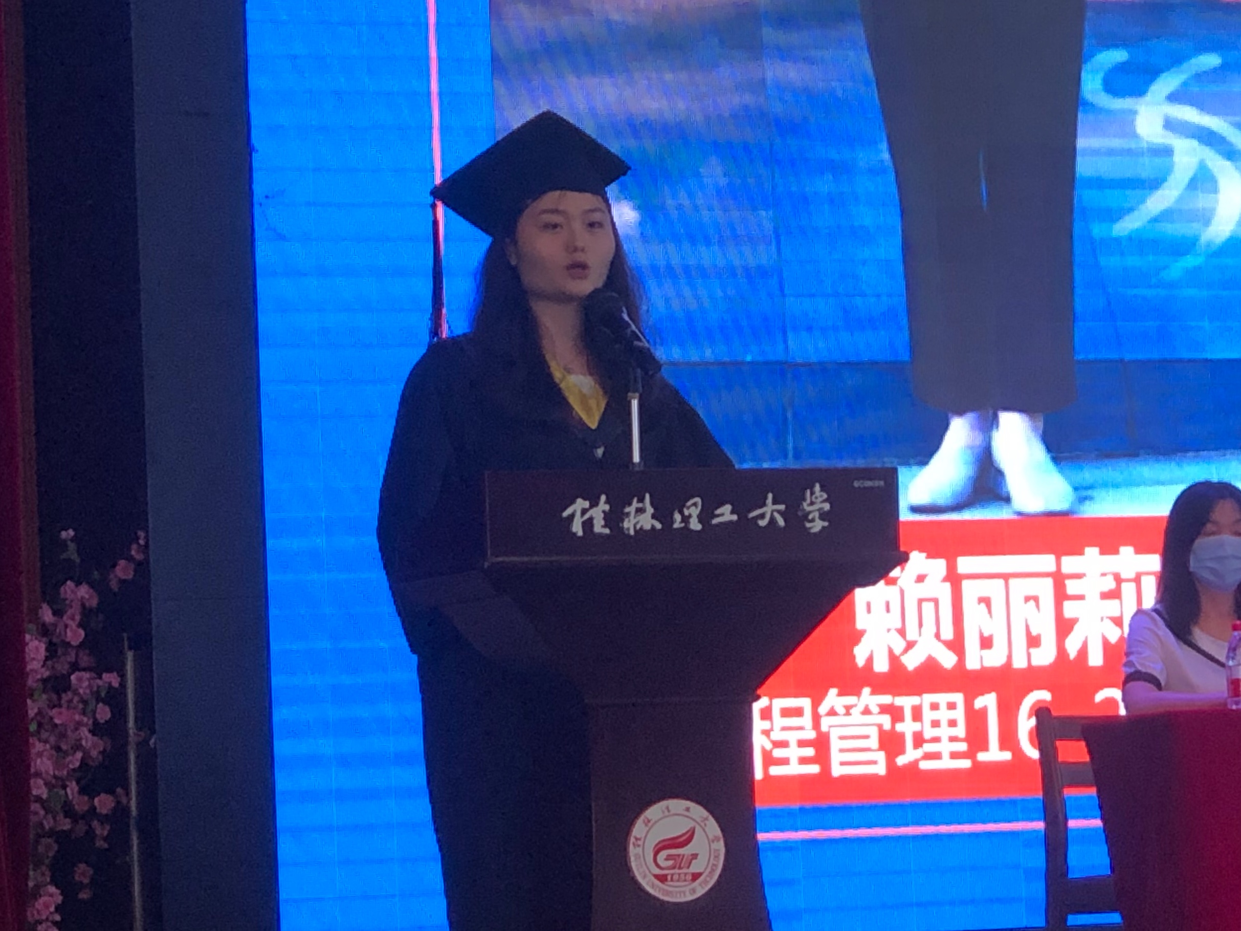 土木精神,独树一帜。6月22日,2020届本科毕业生毕业典礼暨学位授予仪式在分校体育馆举行,校领导为毕业生们拨穗、颁发学位证书,合影留念。典礼上,我系优秀学子赖丽莉同学作为毕业生代表上台作精彩发言。赖丽莉同学回顾自己四年来在桂工的点滴美好回忆、不断进取的经历、不懈努力的成绩。她对毕业学子们提出三点要求,坚定理想,砥砺奋斗;求真学问,练真本领;铭记校训,锤炼品格。