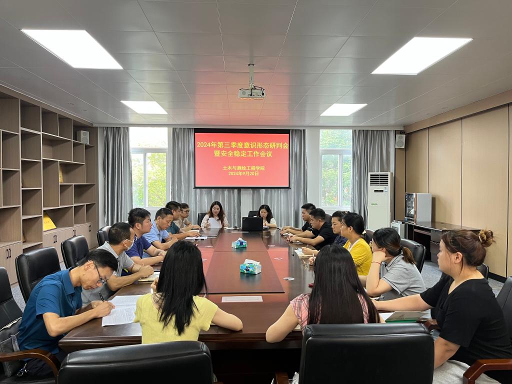 9月20日,我院在物华楼406会议室召开2024年第三季度意识形态研判会暨安全稳定工作会议。我院领导班子、辅导员、各教研室主任参加本次会议。会议由学院党委副书记何建金主持。