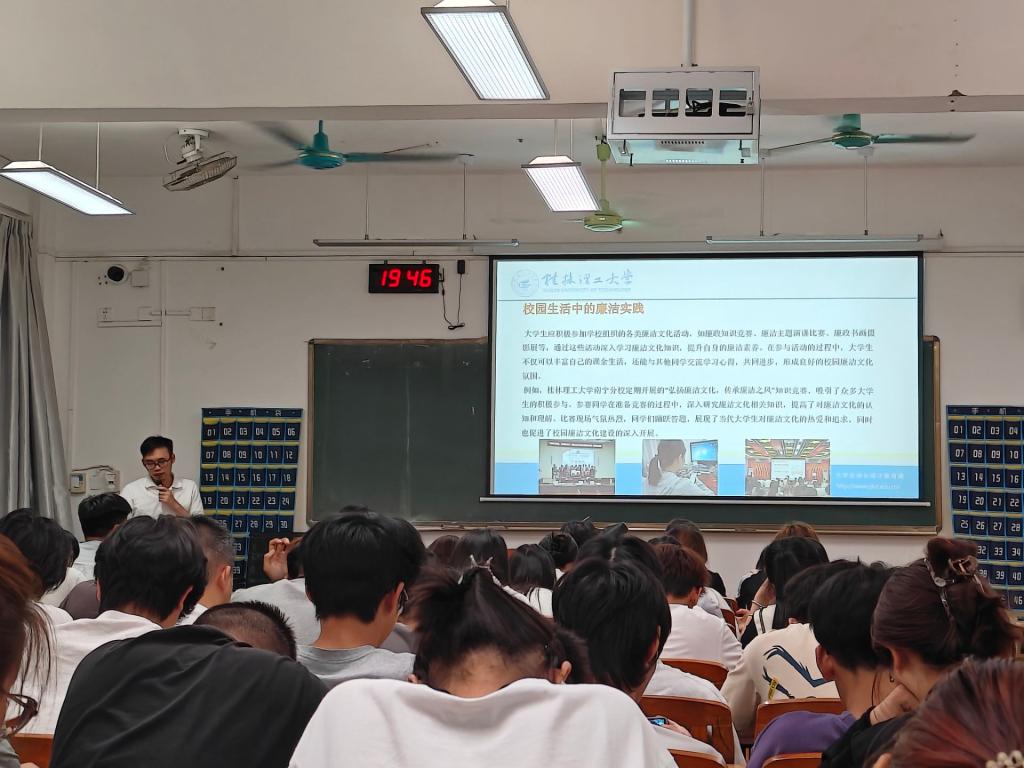 课堂上,辅导员详细解读廉政文化文件精神,引导学生从思想层面理解廉政文化的重要性。同时,通过介绍学校廉政文化建设的成果,增强学生的认同感。辅导员还提出大学生践行廉政文化的具体要求,倡导学生从自身做起,遵守校规校纪,积极参与廉政文化活动,做到言行一致。此外,课程还强调文明礼仪教育,要求学生注意课堂纪律和个人仪容仪表,展现新时代大学生的良好风貌。