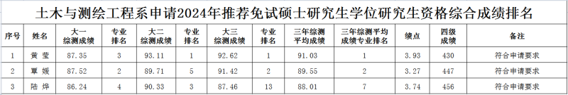 根据《桂林理工大学推荐优秀应届本科毕业生免试攻读硕士学位研究生工作管理办法》(桂理工研〔2021〕10号)和《关于做好土木与测绘工程系推荐优秀应届本科毕业生免试攻读硕士学位研究生工作的预通知》文件要求,土木与测绘工程系2024年推免生遴选工作领导小组研究决定,拟推荐工程造价2020级本1班黄莹参加分校2024年优秀本科毕业生免试攻读硕士学位研究生评选。现将系部申请学生的综合成绩情况公示如下,公示期为2023年9月11日至2023年9月13日,共3天。