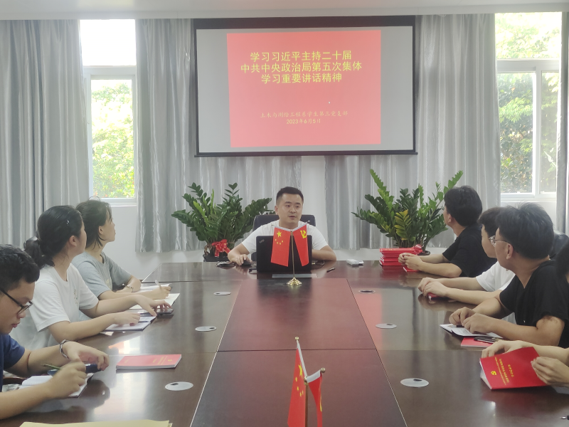 为进一步学习贯彻习近平新时代中国特色社会主义思想主题教育,我系学生第三党支部于2023年6月5日在6406教室学习“习近平主持二十届中共中央政治局第五次集体学习”重要讲话精神,此次活动由刘飞同志主持,全体党员同志参加。