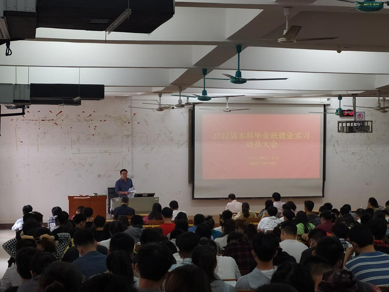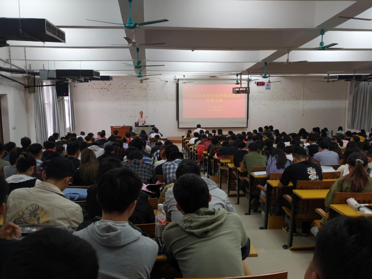 为深入贯彻落实党中央“稳就业”“保就业”的决策部署,引导毕业生树立正确的就业观,2021年10月28日下午,我系于8208D教室召开了2022届本科毕业班学生实习就业动员大会。我系主任刘茂军、党总支书记黄文学、党总支副书记兼学工组组长罗勇、副主任赵凤阳、许国平、辅导员李伟、刘文武出席大会,我系全体2022届本科毕业班学生到场与会。