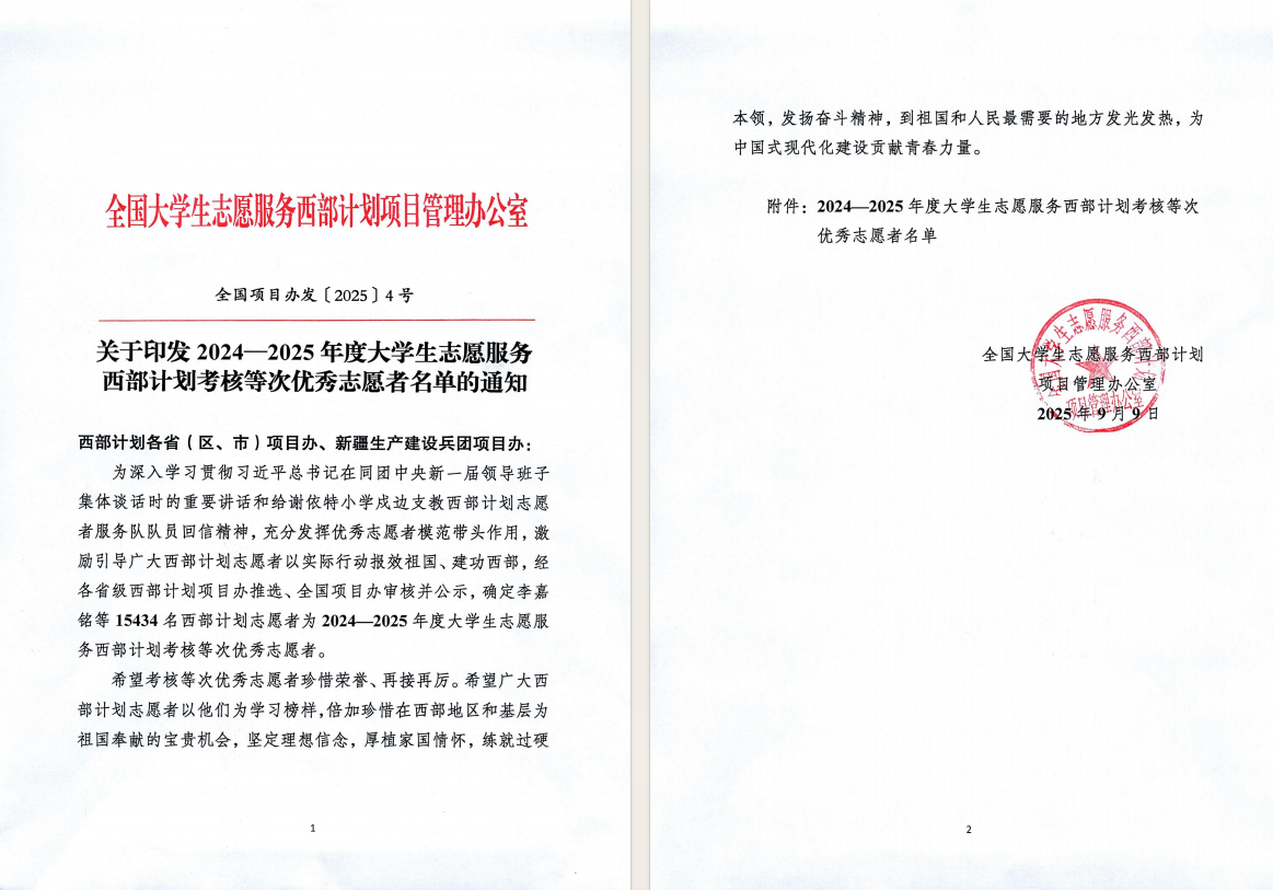 我院工程造价专业2019级本科生黄念金同学,毕业后积极参加大学生西部计划,前往广西壮族自治区崇左市大新县那岭乡人民政府开展服务。服务期间,黄念金同学恪尽职守,勤勉工作。他积极协助处理各项日常事务,深入村屯了解民情,参与政策宣传与落实,用实际行动诠释了西部计划志愿者的初心与使命,在2024-2025年度大学生志愿服务西部计划考核等次优秀志愿者!