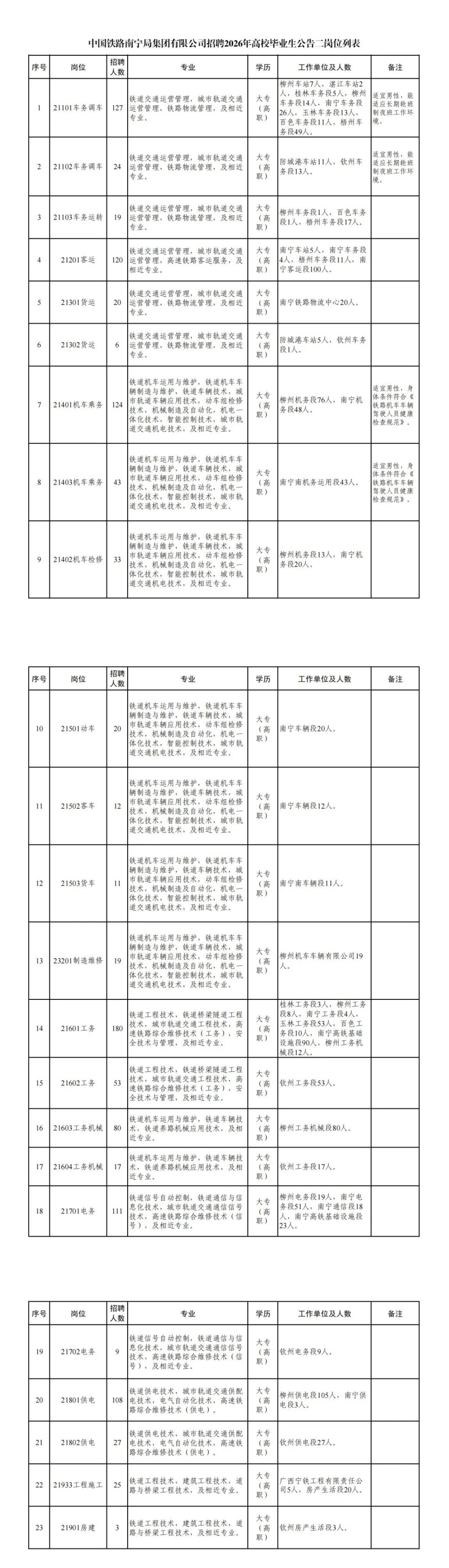 岗位:本次计划招聘1191人,具体招聘岗位、专业、人数详见附件《中国铁路南宁局集团有限公司招聘2026年高校毕业生公告二岗位列表》。