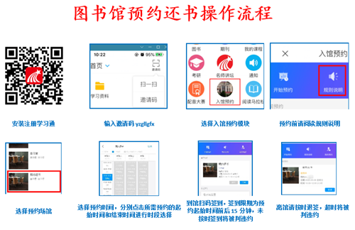 登录学习通APP →输入邀请码yzgllgfx进入分校主页 →选择“入馆预约”中的“预约还书”即可进行预约(预约前请仔细阅读规则说明)