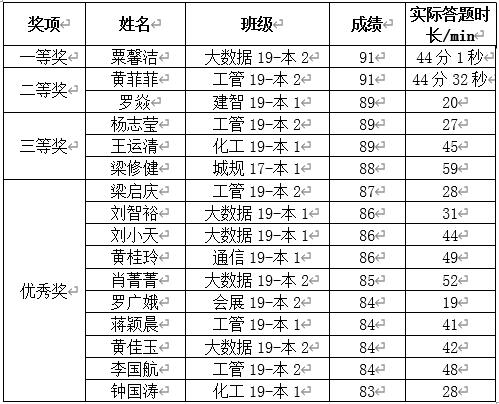 根据《关于举办首届信息素养大赛的通知》要求,图书馆主办的首届信息素养大赛于2020年10月9日——16日成功举行,本次比赛历时八天,共 500名同学报名参赛,经网络答题,竞赛系统评分,再经过评选,最终获奖名单公布如下: