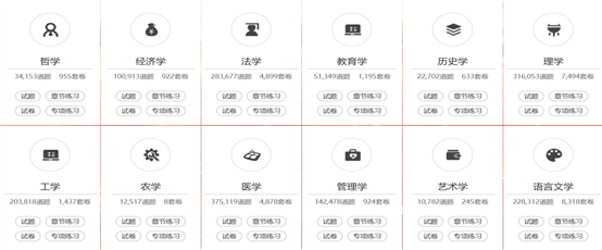 是以高校课程试题为主要内容的试题资源,包含了教育部12个学科大类、100个二级学科、400余个三级学科类目下的3.2万套课程试卷,收录试题量已达到190万道,可以为老师组织考试提供资源帮助,也可以提供学生线上查看试题内容和答案、收藏试题进行有针对性地练习复习使用。