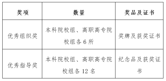 1.优秀组织奖:为激励各高校积极组织学生参与主题知识竞赛活动,主办方将根据各高校的参赛人数、成绩与活动组织情况,对本科院校、高职高专院校分别进行排名,评选优秀组织奖12所(本科院校组、高职高专院校组各6所)。